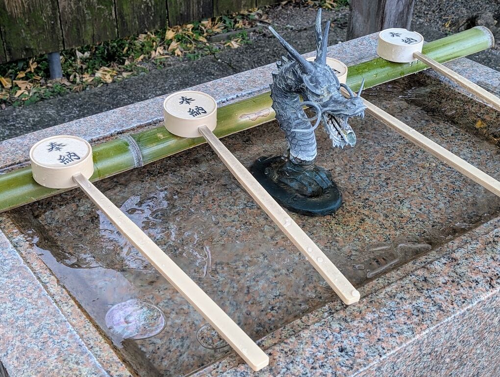 普段は龍の口から水が出ている手水舎も止水されていたのか凍結していたようで凍った表面の氷を割って手を清めさせて頂きました。既に氷の一部が割られていましたので、自分より早い時間にお参りした方が氷を割ってくれたのでしょう。