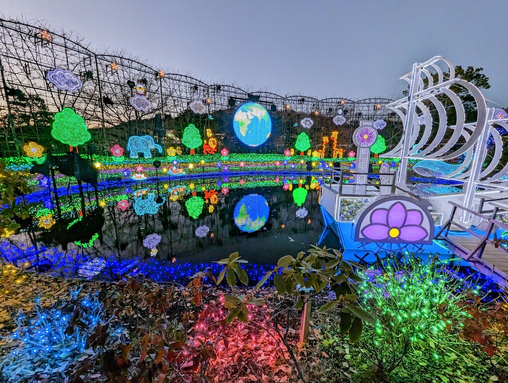 イルミネーションがキレイとのことを聞いていましたが今回は3人とも初体験。日が暮れるちょっと前に到着しましたが、これがまた驚くほどの大混雑。
