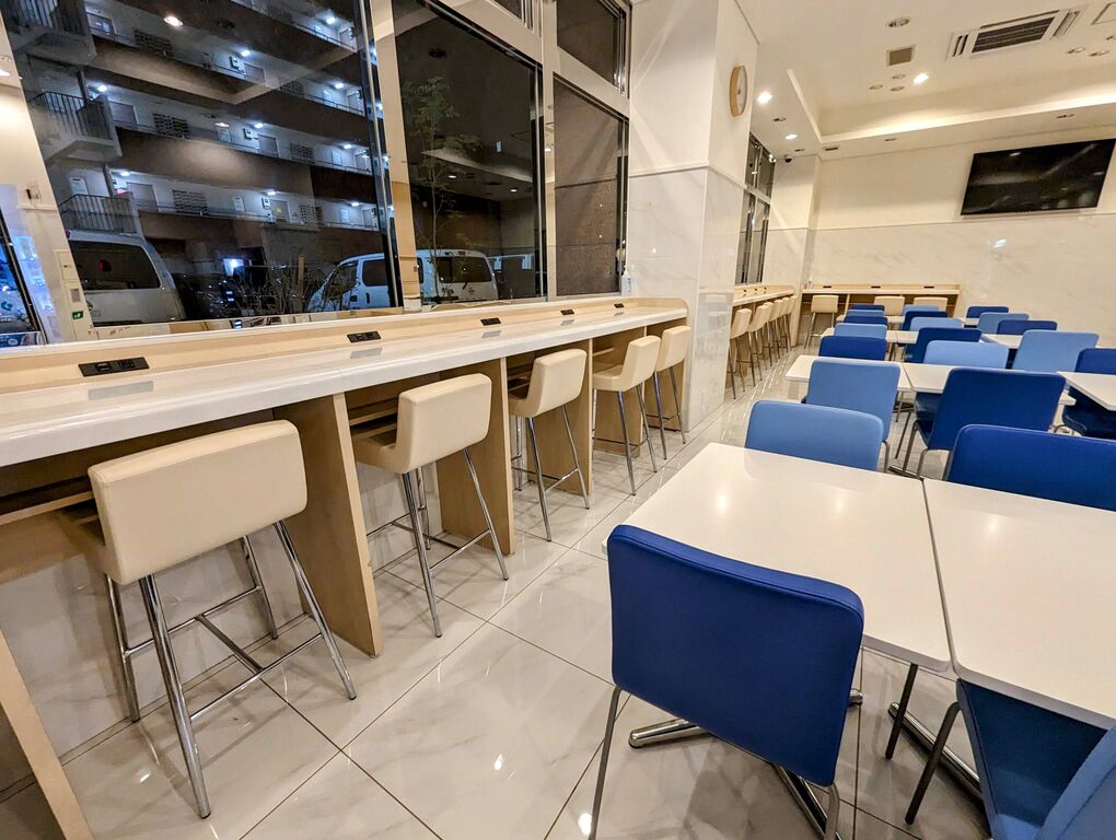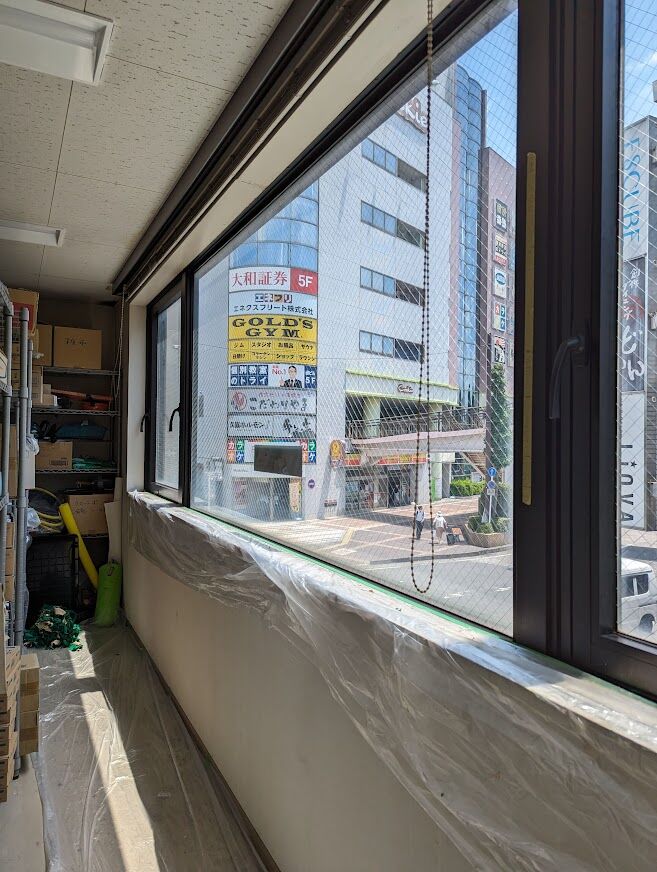 看板と言ってもガラス部分に関しては大きなフィルムを貼り付けている感じで、管理用設備品の収納倉庫にしている部分に関しては、普段はブラインドで目隠しされた上に数多くの在庫部品が積まれていることで「ここに窓があったんだ」と、新鮮な気分になりました。物置にするには勿体ない場所かと思いましたよ。