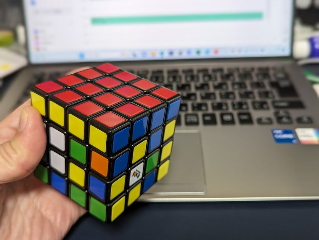 1年ちょっと前に購入して以降、難しすぎて放置していたルービックキューブの4×4版を久しぶりにチャレンジ。何とか1面と下部のコーナーキューブを正しく揃えるまでは出来るのですが、それ以上先に進められません。