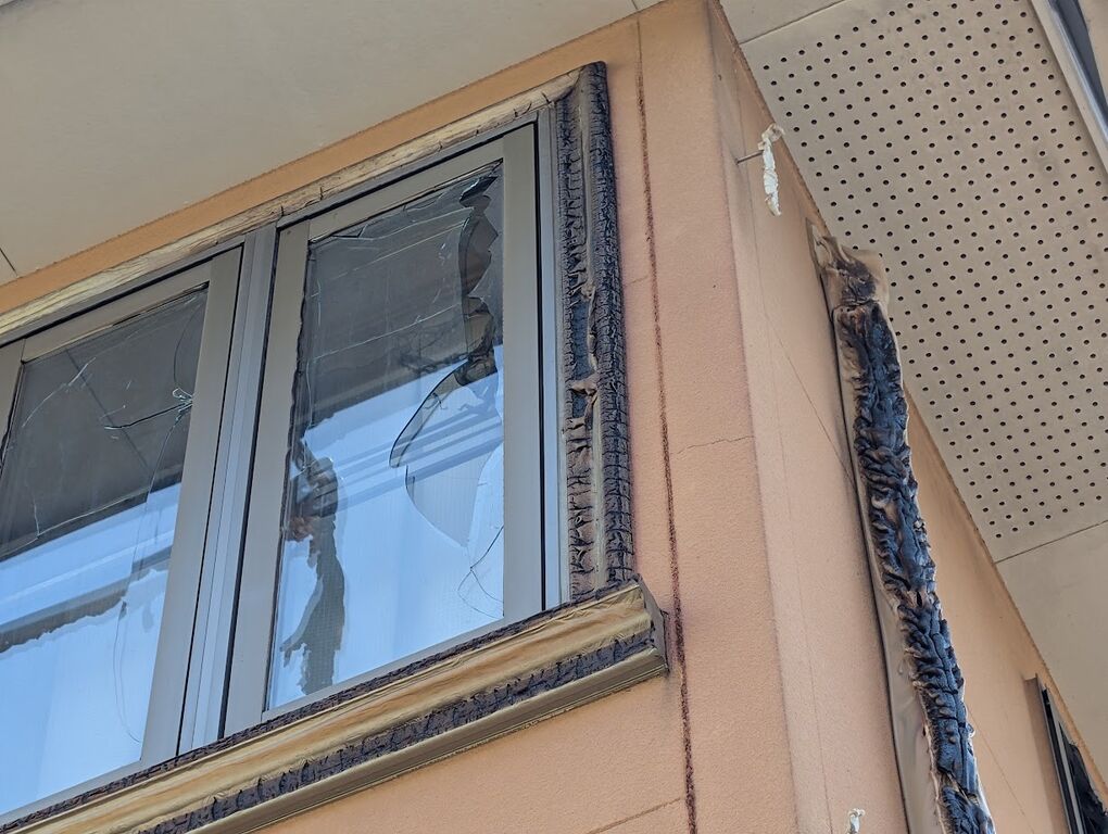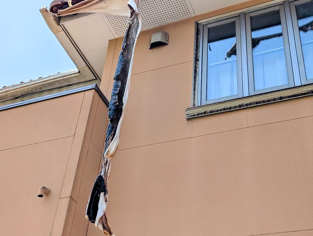 火元の家から我が家までは、一番近い建物の角までで4m道路の幅くらい離れているのですが、昨日は風が無かったので雨樋やエアコンの配管、網戸が溶けてガラスが割れた程度で済んだのでしょう。