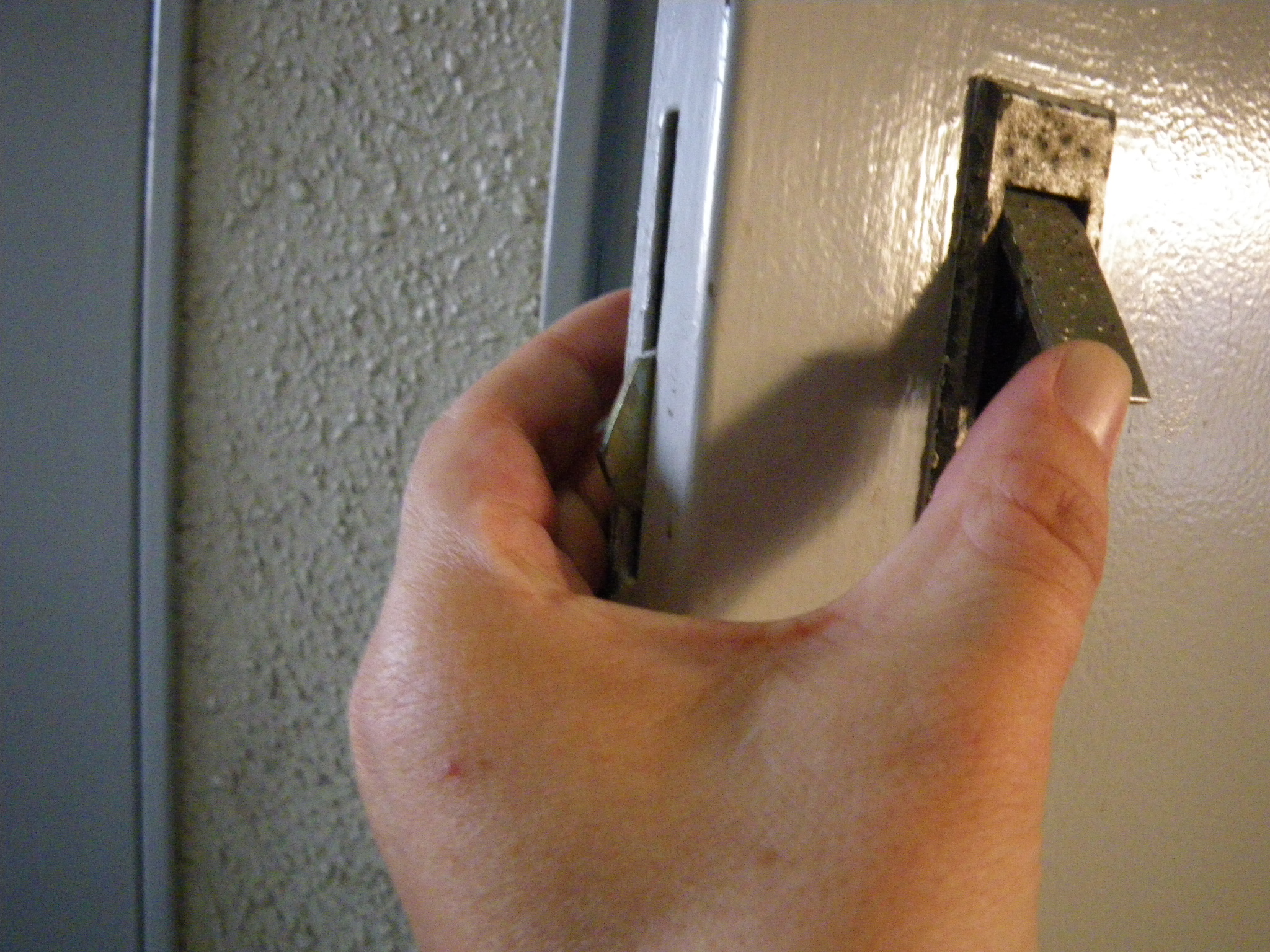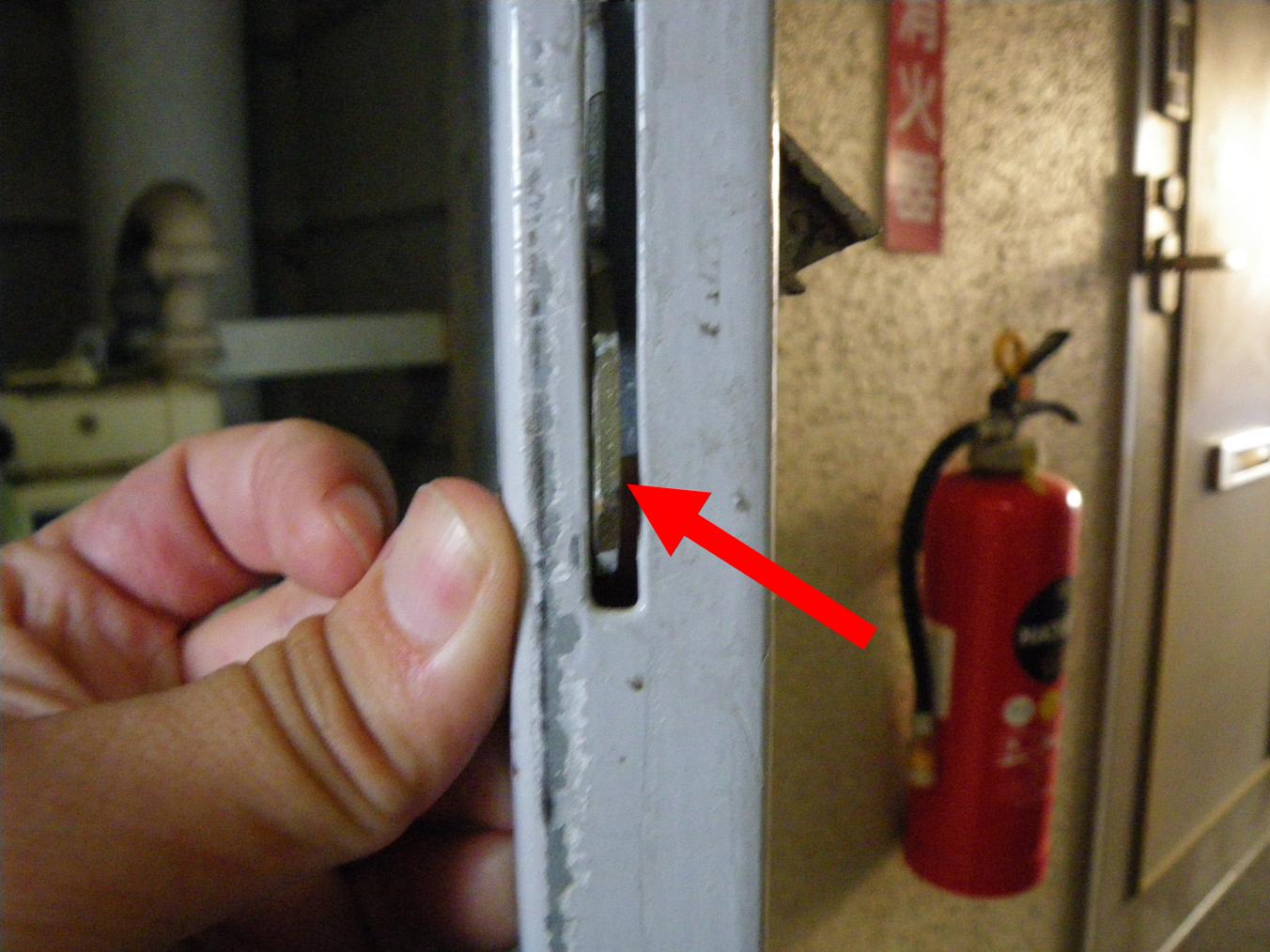 扉の裏側からロック用の金具を押さえて位置を調整して1ミリくらい微妙に金具の頭を出しながら扉を閉めます。
