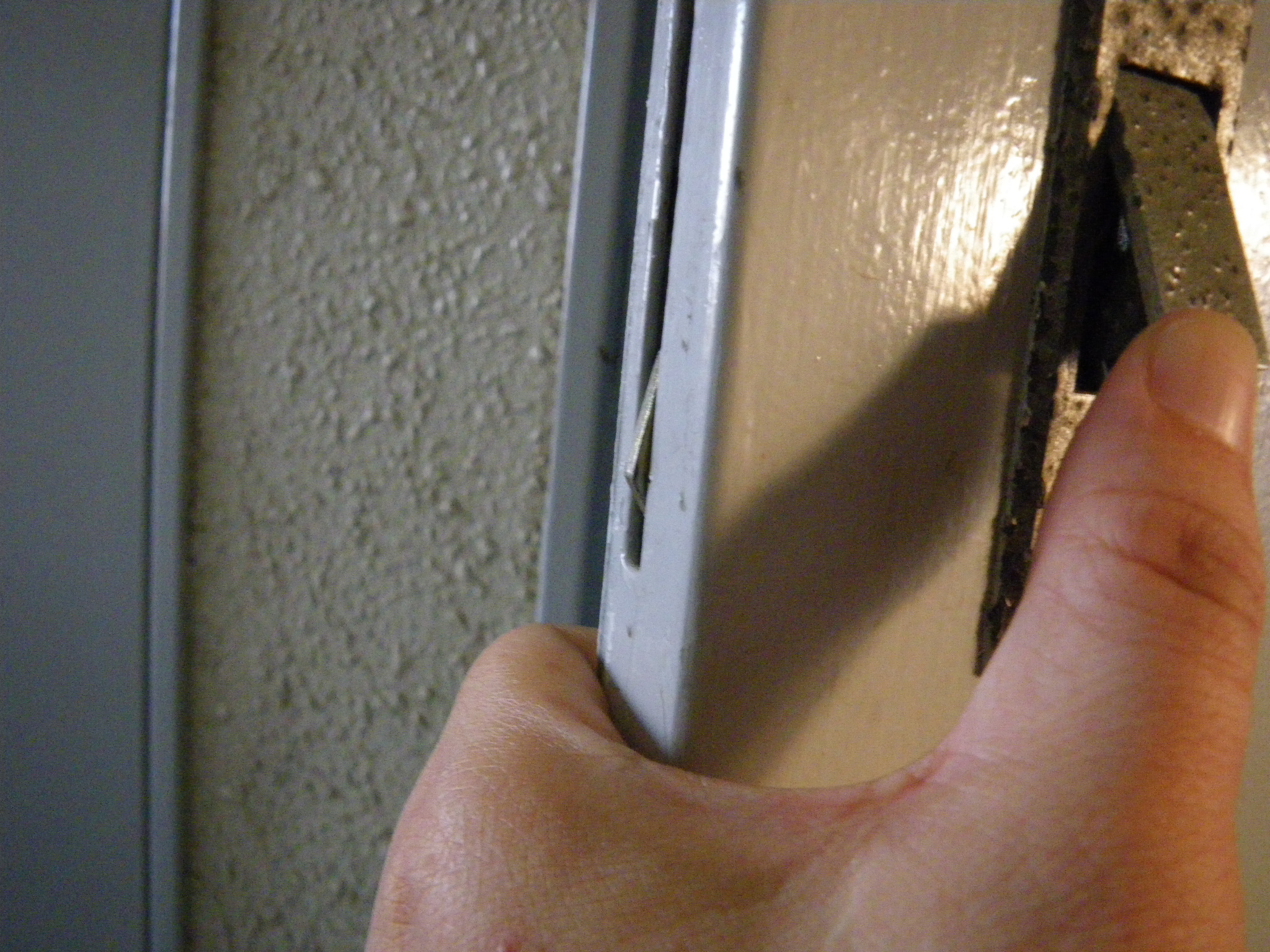 扉を横から見るとわかるのですが、扉ロック用の金具がズレて引っかかっているだけなんです。