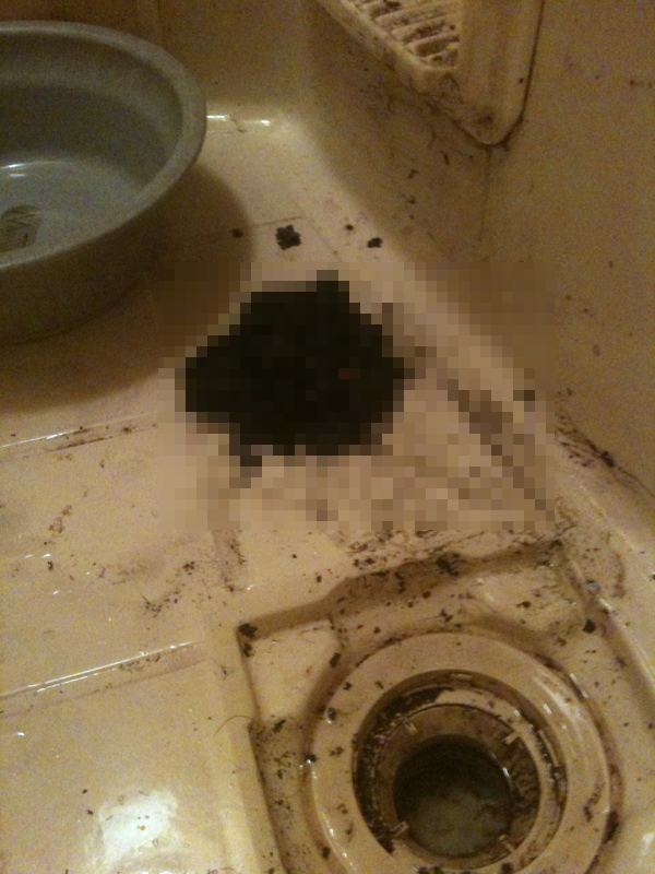 さっそくS君が排水溝の詰まり除去作業を開始。クマ 「ほら、こんな感じで詰まらせたの放置してたんですよ」