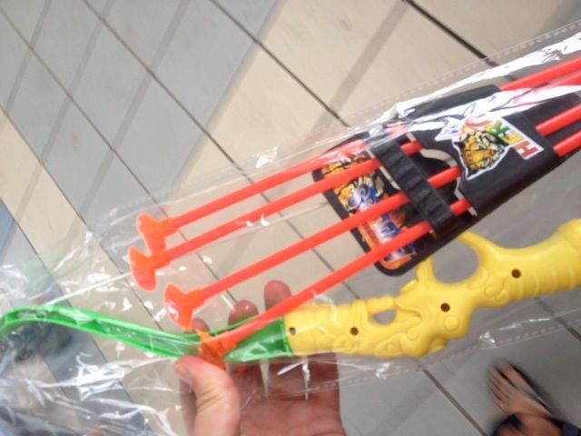 ラジコンか鉄砲が欲しいと騒いでいたのですが、200円で売っていた吸盤式の弓矢で満足してくれました。