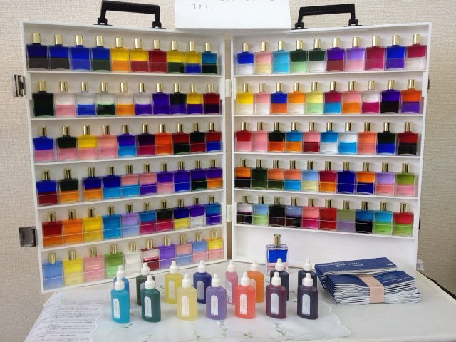 いろんな色が並んでいて見てるだけで癒されますし、選んだ色の番号で該当する香水までつけさせてくれて1時間くらい良い香りが腕に残ってました。