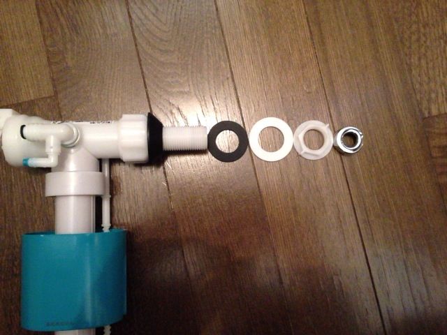 一番右が上の写真の金具でその間にゴムパッキンが挟まって次にプラスチックの締め付け部品、プラスチックのゴム受け、ゴムリングの順番がタンクの外側です。