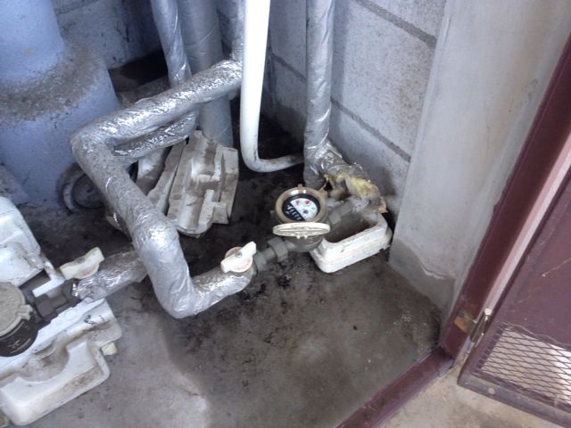 現地へ行ってみるとメーターの下あたりが湿っています。しばらく閉めてあった水栓をリフォームの為に開栓して漏水した様子です。