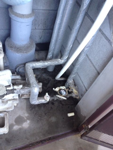 漏水した水が室内への給湯パイプを伝って入りこんでいる状況でした。ガス屋さんの工事で漏水は止まり、どちらにしろリフォームで壁や土間床の張り替えをするので助かりましたよ