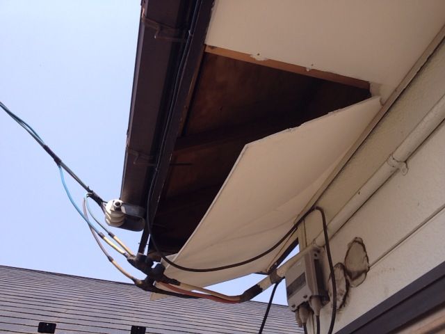 屋根ではなく軒天でよかったです。ただケイカル板が落ちるのも危険なので隣の方が連絡をくれてよかったですね。