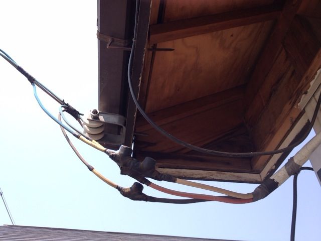 と、頼まれたので軒天を貼り直そうと思ったのですが、よ〜く見てみると軒天がはがれた原因がわかりました。電柱から建物に引かれている電線が全く余裕なく張られていて、接続部分の金具が引っ張られて壁の一部が曲がっていました。