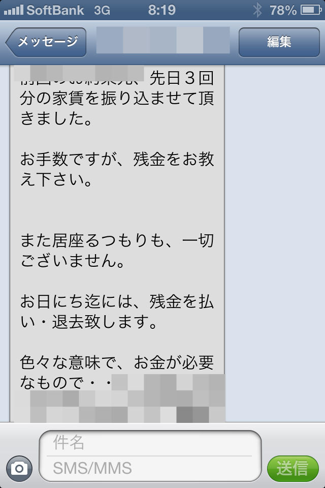 何度か訪問して滞納金の支払いと退去の請求をしていましたが、結果としてショートメールのやり取りで3ヶ月の賃料回収と7月末日での完全明渡が完了しました。