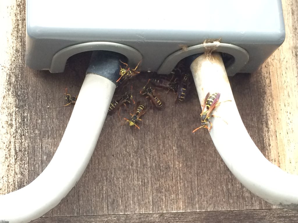 「電気メーターのところに大量のハチがいて怖くて部屋の出入りが出来ません」うちの地域はハチの苦情の場合、90%以上アシナガバチです。