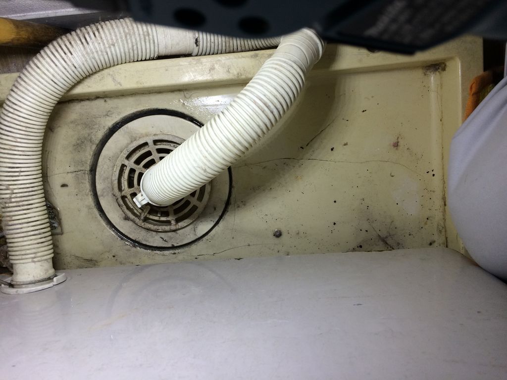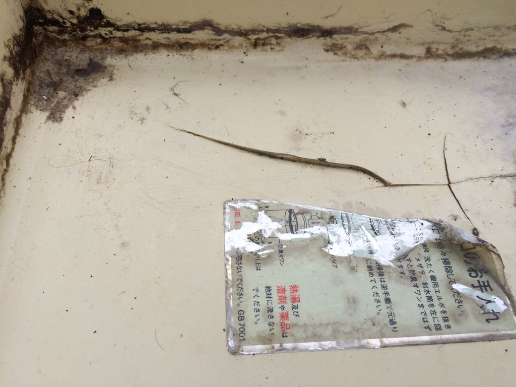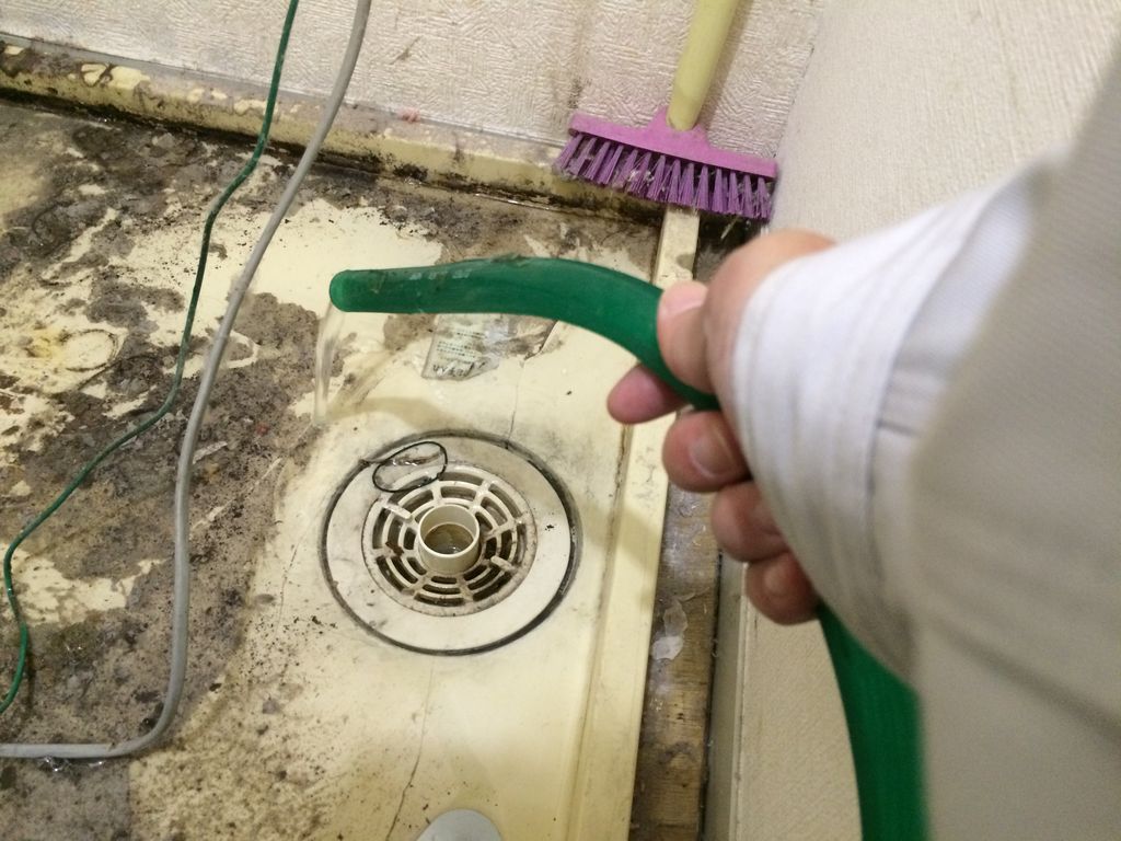 こんな状態ではヒビも穴もわかりませんので、水洗いしてみました。と、調子に乗って洗っていたら下の階から「漏れてます!」との大声が聞こえて作業ストップ・・・