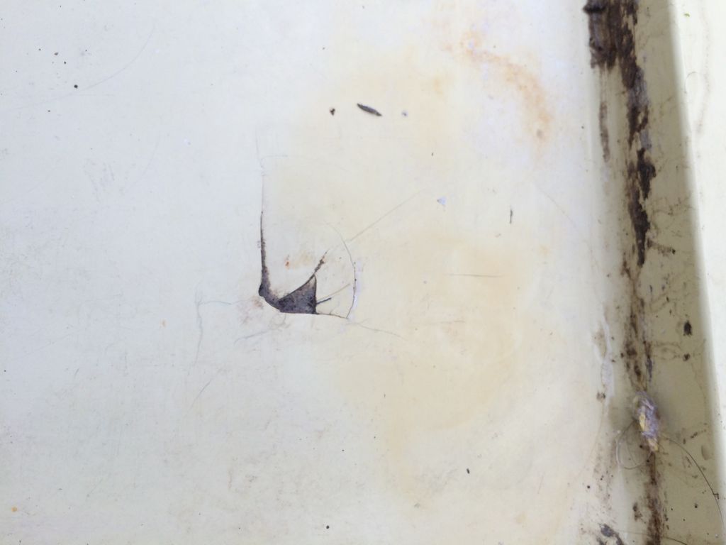 外した防水パンを外に持っていって洗ったところ、大きな縦キズと