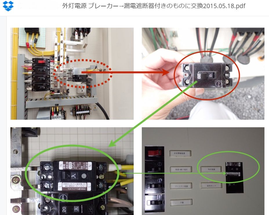 そこで、一番漏電の可能性が高い外灯系の回路に漏電遮断機を取り付けました。