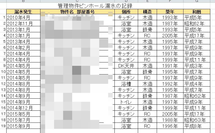 で、昨日は過去のデータをまとめて築年や構造、漏れた時期を書きだしてみたところ・・・