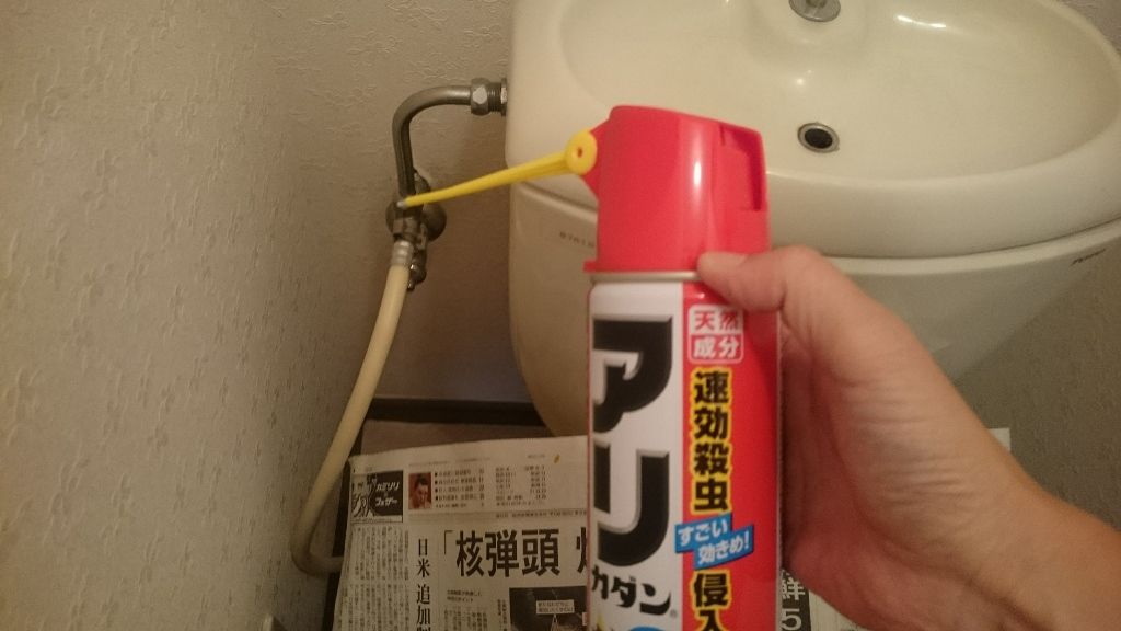 侵入経路は、給水管の壁との隙間ですので、床下から上がって室内に侵入した形です。既に、奥様が掃除機で吸い取り、トイレ用の消臭スプレーを噴射して大半が死んだとの事です。