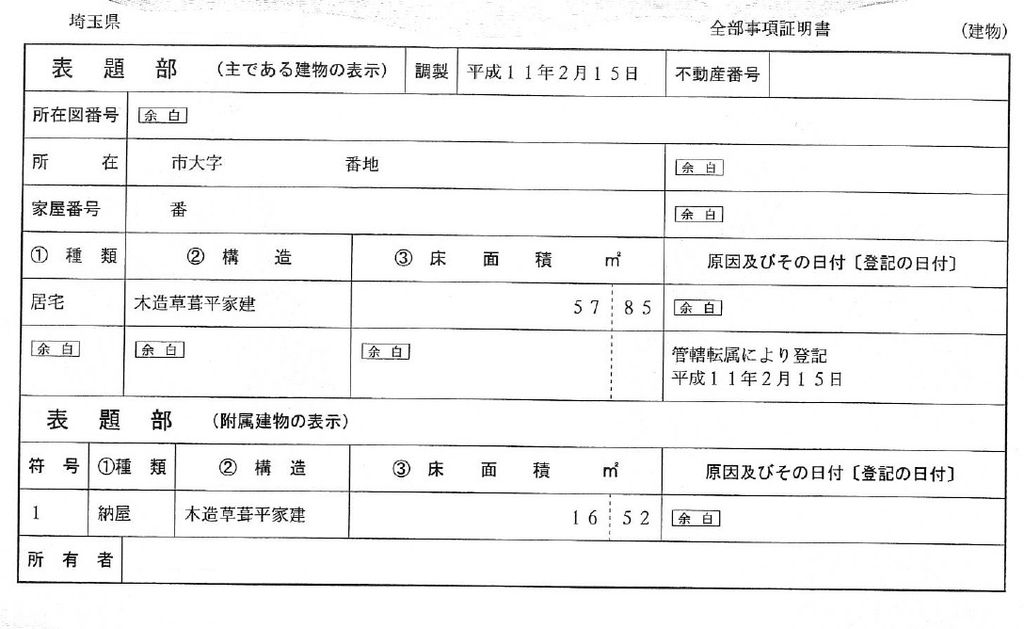 通常は、新築した際に所有権保存登記を行うのですが、建物を建てた際に登記しなかったそうで、表題部だけの登記が残っていました。