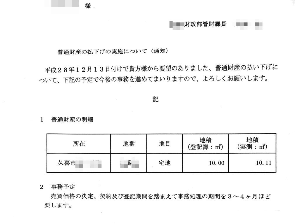 道路の向かいにある地権者との境界確定他、いろいろ時間が掛かりまくっている状態だったのですが、先日やっと、市役所の管財課から「受託したので手続きに入ります」との通知が来ました。道路管理の部署で分筆登記までを終わらせる為に半年も掛かったのですが、今度は管財課の担当になって市からの払い下げ(売却)価格を決定する手続きに入る段階となったのです。