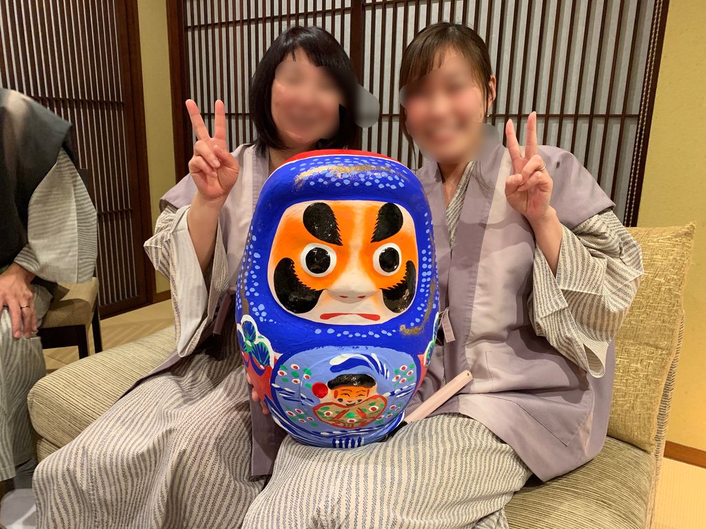 ステキなお宿ですね。本当に社員研修や社員旅行に行ったことのない私には羨ましい内容のブログです(^ ^)。青いダルマさん迫力がありますね。ダルマさんは後から目を書き入れるのかと思っていましたが、それだけではないのですね。