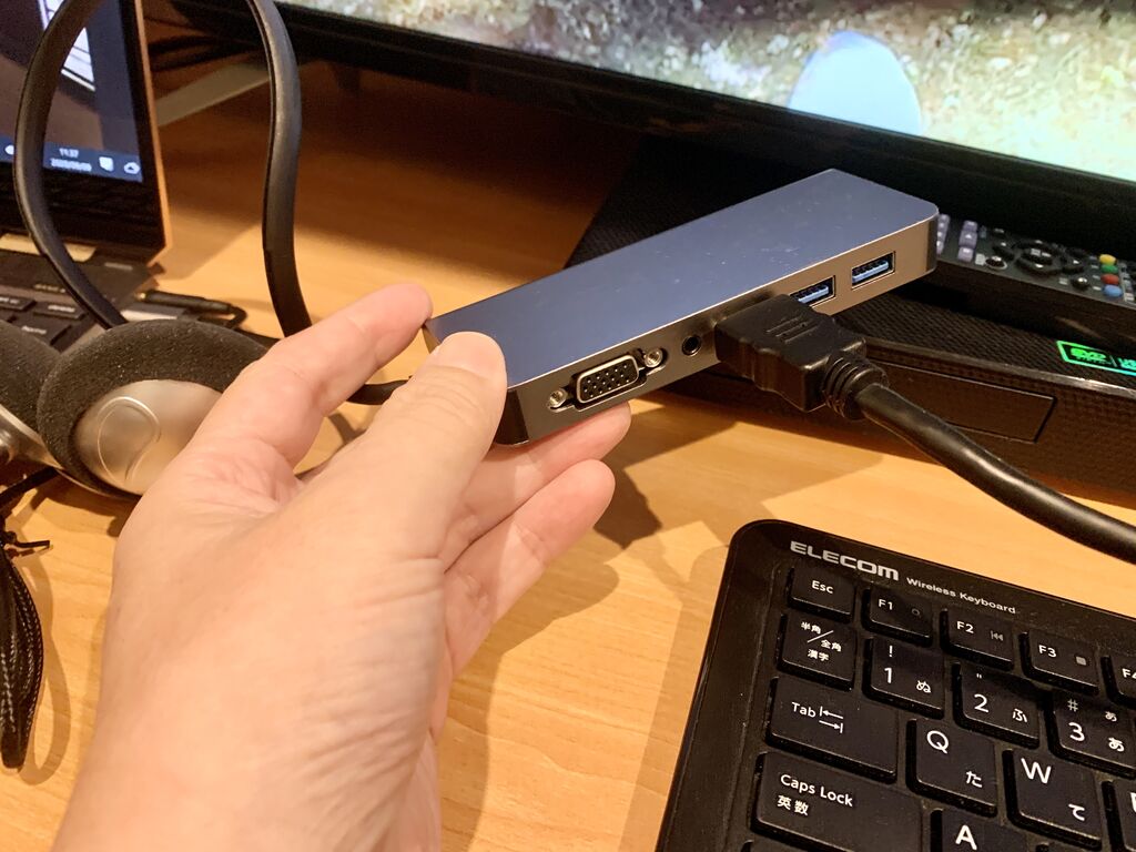 早速、持って来た自分のノートパソコンと部屋にあるパソコンのHDMIケーブルを引っこ抜いて繋いでみたところ簡単にダブルモニターとして利用できました。