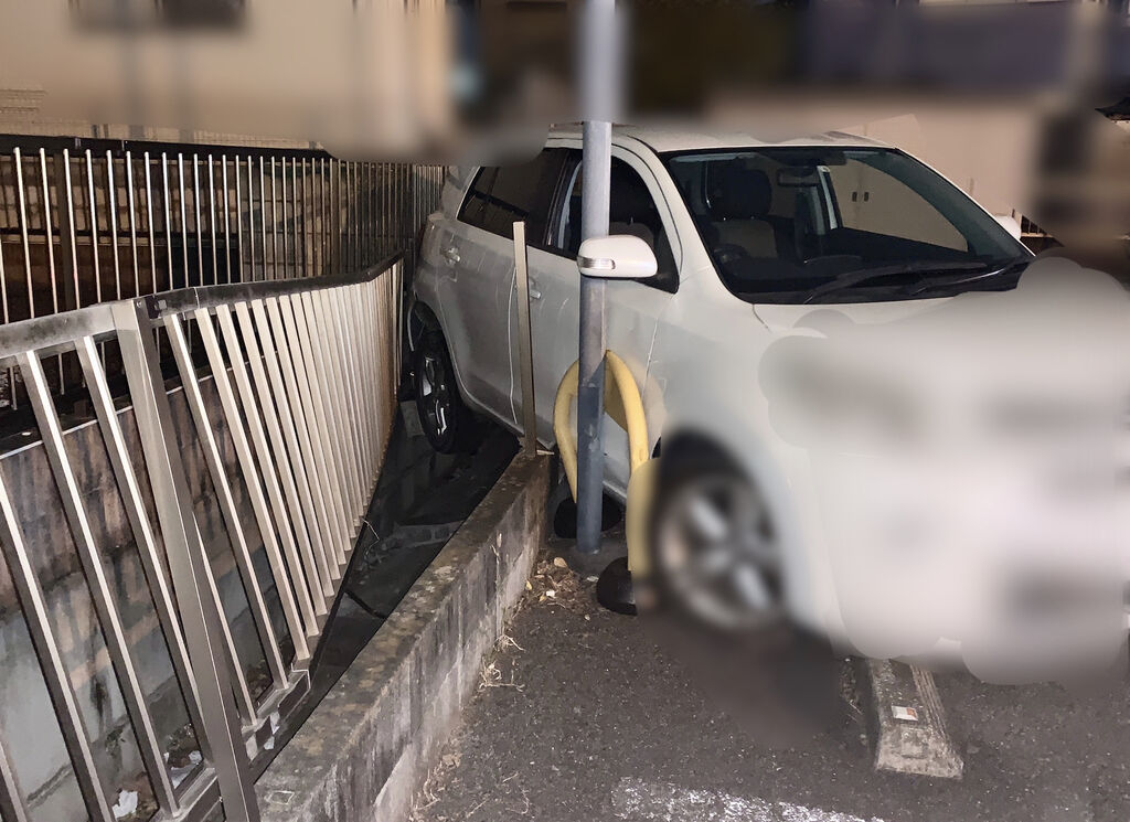 物損事故を起こした運転手さん、近くの接骨院のお客さんで、駐車場所を間違えてUターン的にバックしたところフェンスに激突したとのこと。