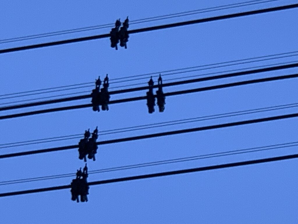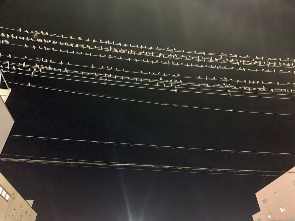 まぁ 実に迷惑な感じですが、日没頃から電線に集まって、朝の出勤時にはいませんので日の出と共にエサ探しに出かけているのでしょう。