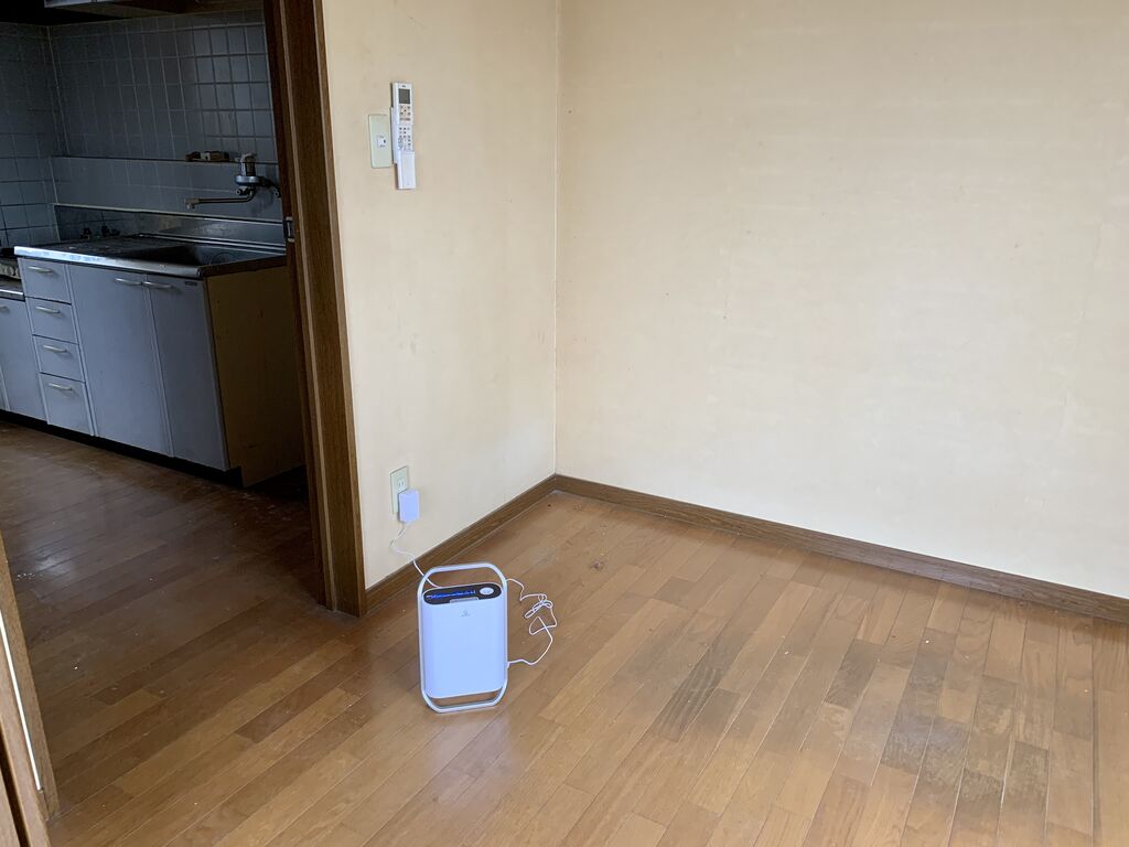 と、言うことで昨日の夕方、別件のヤニ部屋でどのくらい効き目があるか試そうと思って機械をセットしてきました。このヤニ部屋、スモーカーさんが20年居住されて退去したのですが、いろいろあってリフォームが着手されていな状態なのだそうです。