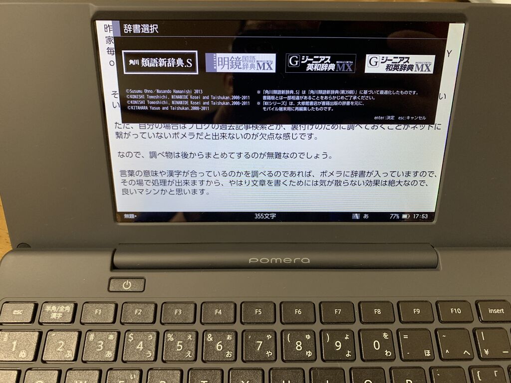 まぁ 昔のワープロのプリンタ無しみたいなマシンですが、言葉の意味や漢字の間違いを調べる程度であれば、ポメラに辞書が入っていますので、その場で処理が出来ますから、やはり文章を書くためには気が散らない効果は貴重です。そんな感じで家にいる時のブログ作成ではポメラで書くようにしています。