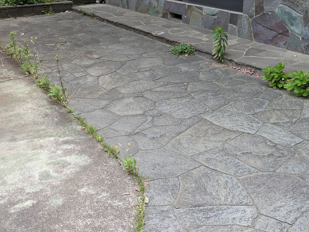 敷地内に雑草が生えていることに気がつきながらも案内をしていましたが、石畳系のお庭なので、オーナーさんとしては草が生えるのを嫌ったのかと思います。我が家もそんな理由で石畳風のインターロッキングにしていますが、施工時のちょっとした油断なのか、地震でヒビが出来たのか、少しでも隙間があれば見事に成長するのが雑草です。