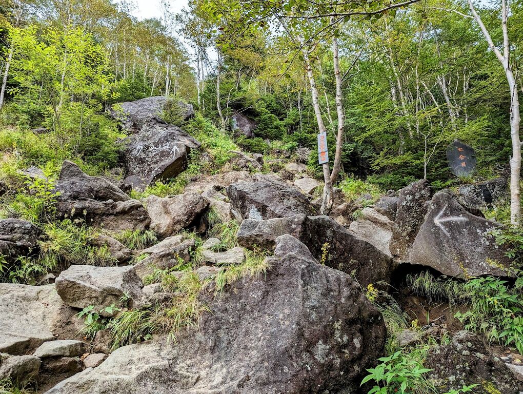 当初は木の根っこが多くて登りにくい状態でしたが、やがて岩だらけな状態となり、場所によっては手を使わないと登れない感じになりました。この岩場の多さが体力消耗と、下りの際に時間が掛かる原因となります。
