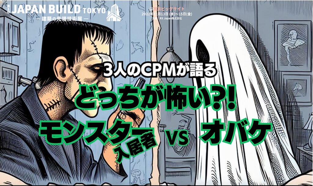 最先端技術の展示会である不動産テックEXPO東京が12月13日(水)から15日(金)まで開催される予定なのですが、その中で15日(金)10時30分から行われる「3人のCPMが語る、どっちが怖い?!モンスター入居者VSオバケ」にパネラー出演の予定です。株式会社PMラボの深澤社長がファシリテーターで、オバケ調査で物件価値を上げる株式会社カチモードの児玉社長と自分がパネラーです。