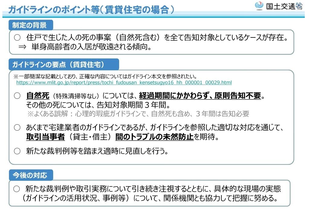 昨日、賃貸不動産経営管理士協議会さんのメルマガより、「人の死の告知に関するガイドライン」について<改めて概要資料が公表されました>との情報が流れて来ました。