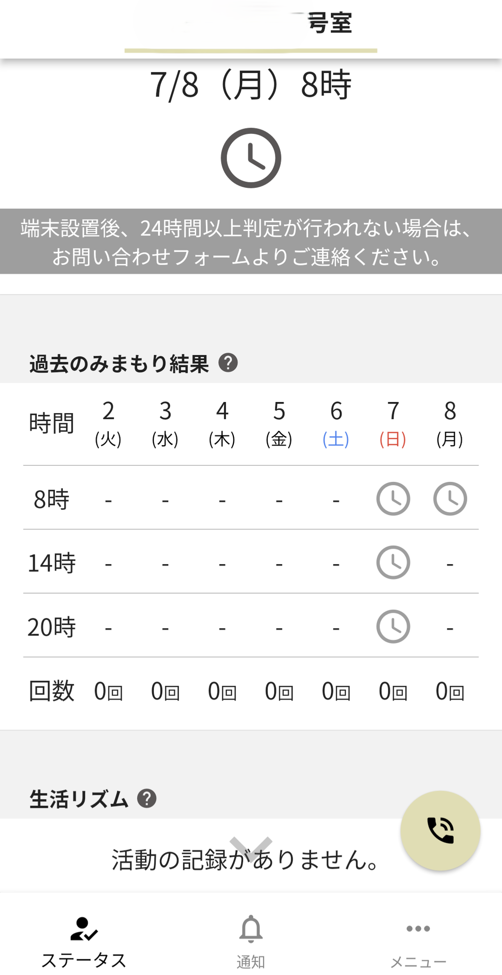 どんな感じで反応するのか楽しみにしていましたが、考えてみれば誰も住んでいない部屋にセットしても無反応・・・こんな感じでスマホのアプリに報告が来るので本来であればセンサーからの異常通報受付は、お身内の方にお任せしたいところです。