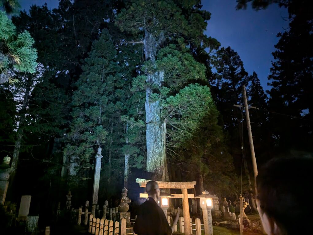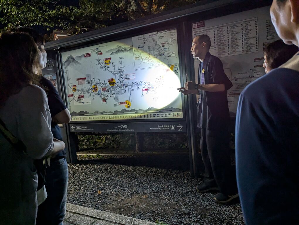 ツァーでは高野山で修業されたベテランのガイドさんが懐中電灯一つで奥の院や墓地群に眠っている武将、ムササビの鳴き声等々を解説してくれます。なので、はぐれなければ安心。