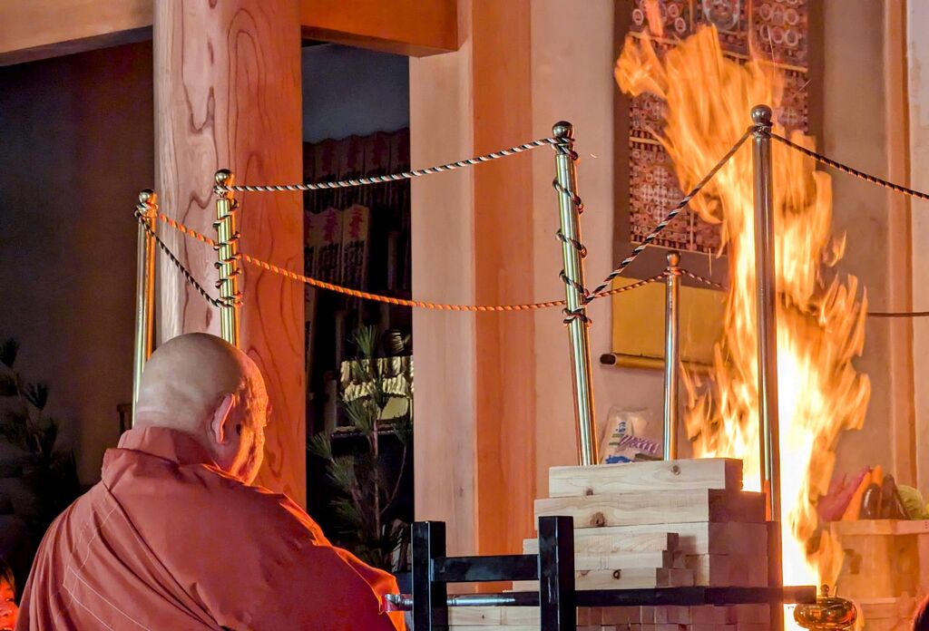 そして、またしても2km歩いて宿坊に戻った後は、護摩行体験。本日のブログの冒頭の建物が護摩堂になっているのですが、12時に始まって2時間近く続く大声での読経を聴きながら護摩の火を見つめさせて頂きました。