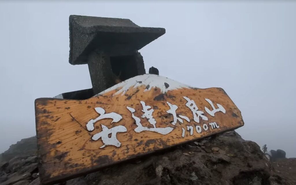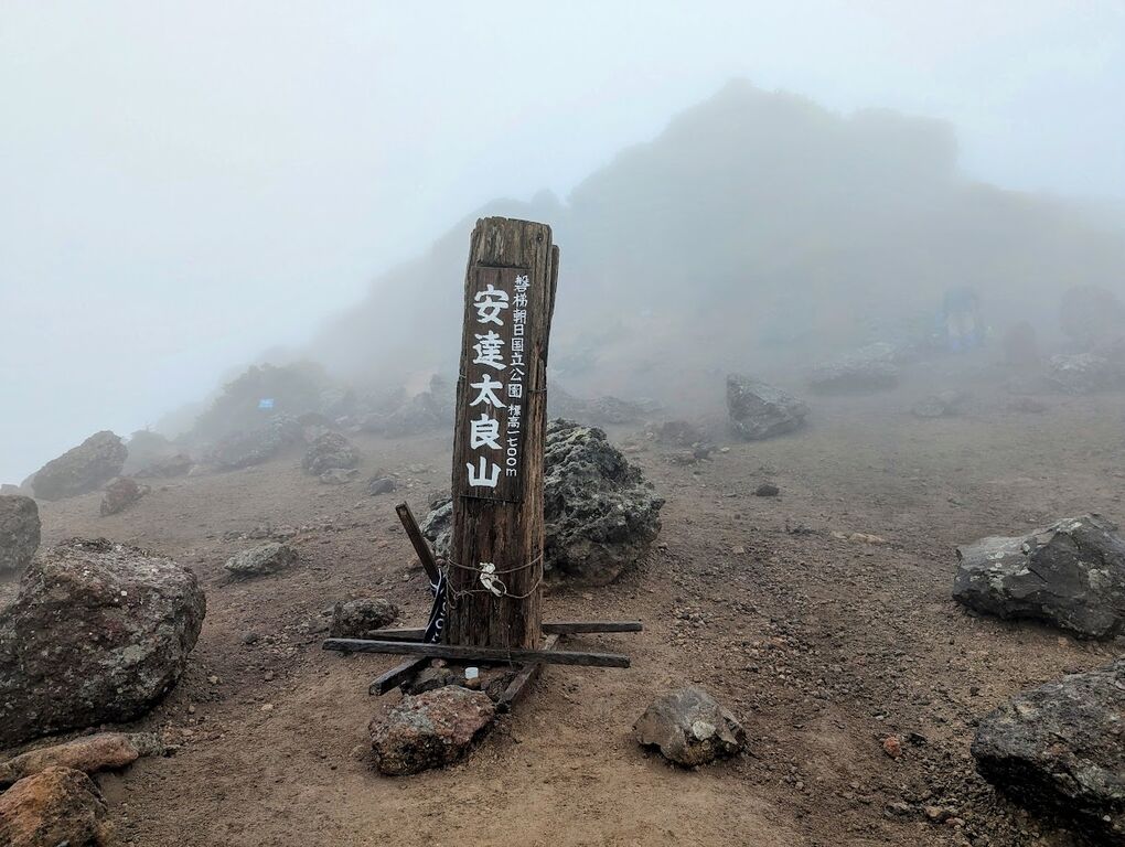 ちょうど60分で山頂到達。現地の標識では75分と書いてあったので、自分の脚力が上達したのかと思ってしまいましたが、霧が薄くなった時に山頂が浮かび出てきました。