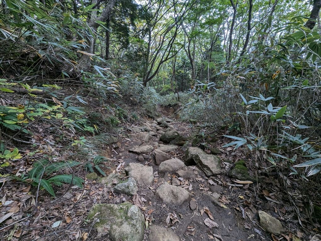 出だしの10分くらいは、傾斜も緩くてウッドデッキのようなコースなので楽勝な気分になっていましたが、10分程度で結構な傾斜と足場の悪さが出てきました。まぁ こう言う登りが無いと山頂へはたどり着かない訳です。