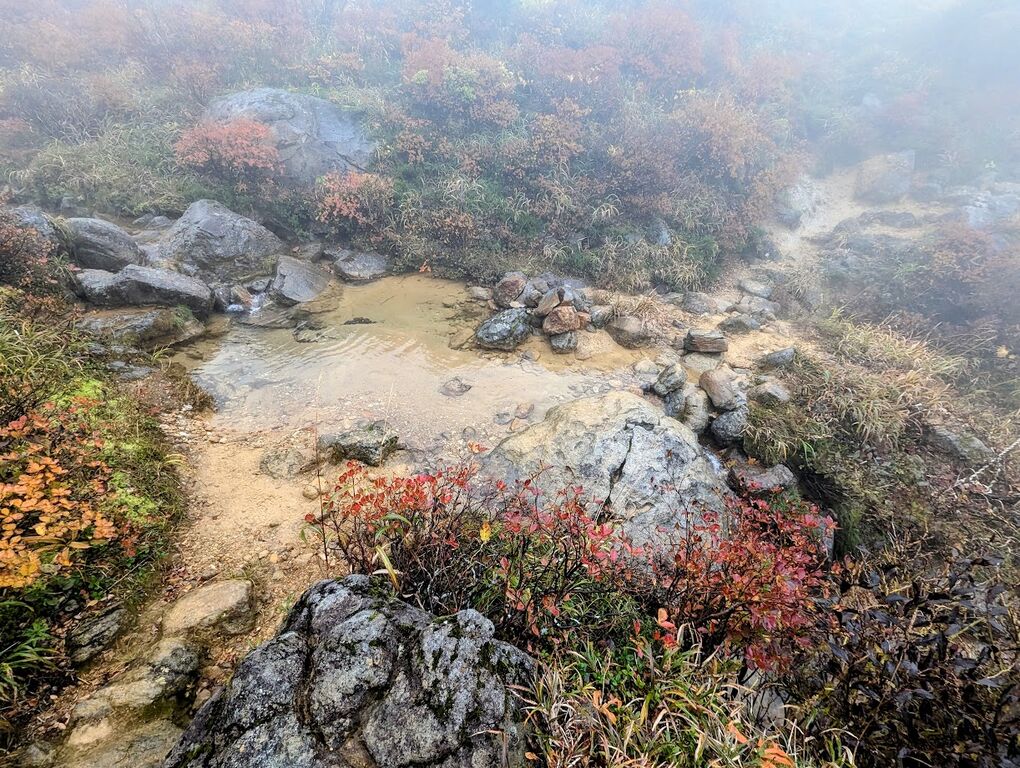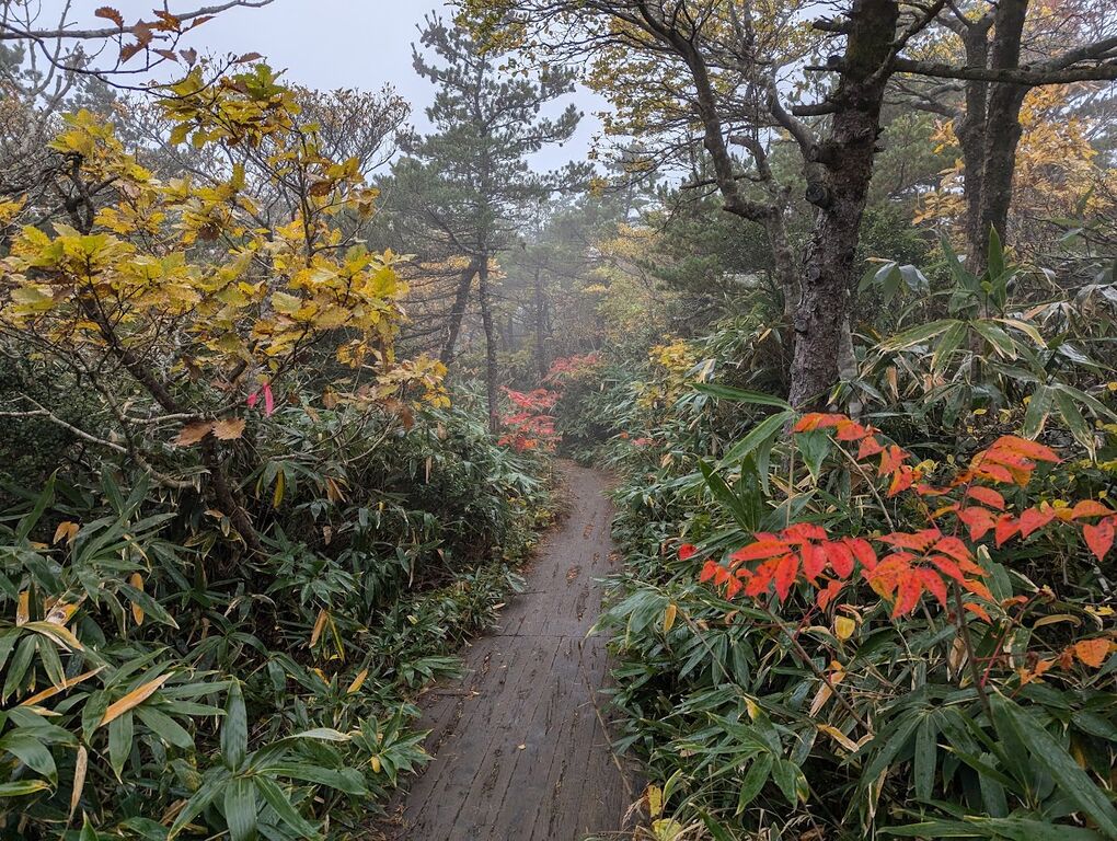 40分も登ると標高の関係で樹木が低くなり、キレイな紅葉を見渡せる感じになるのでしょう。今回は、視界が20m程度なので道の脇にある植物が紅葉していると認識出来る程度なお天気。
