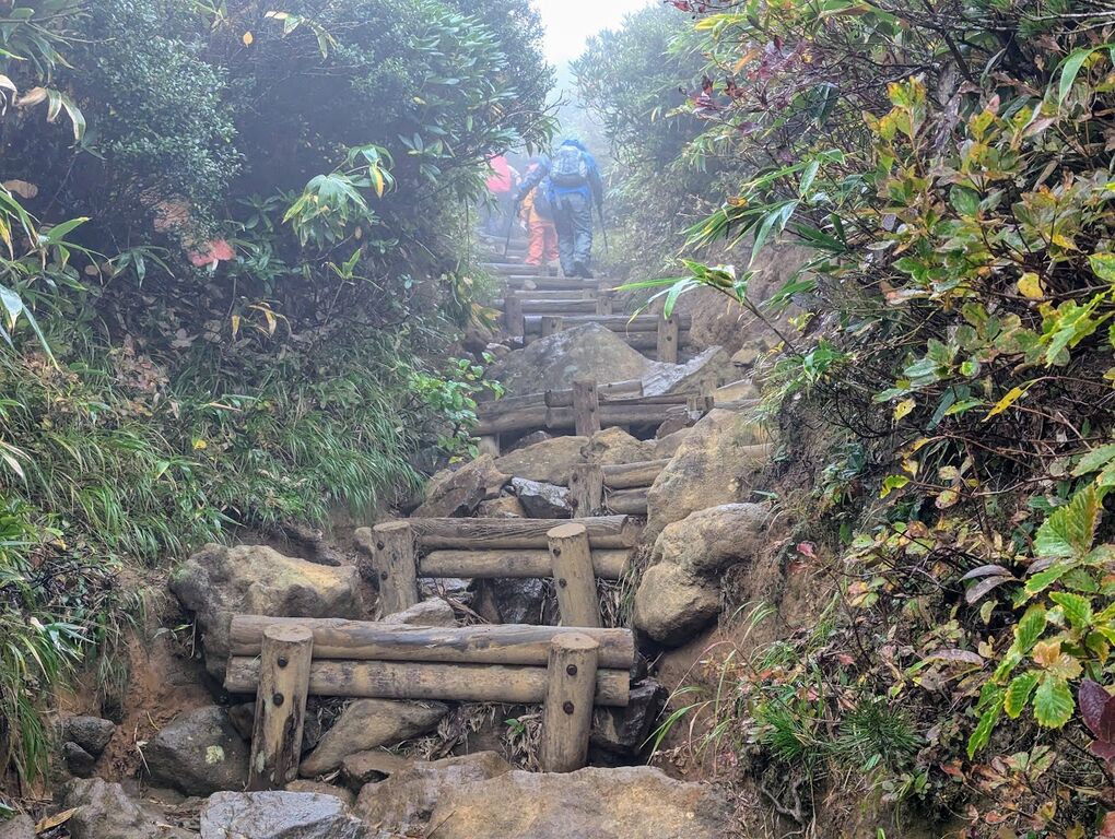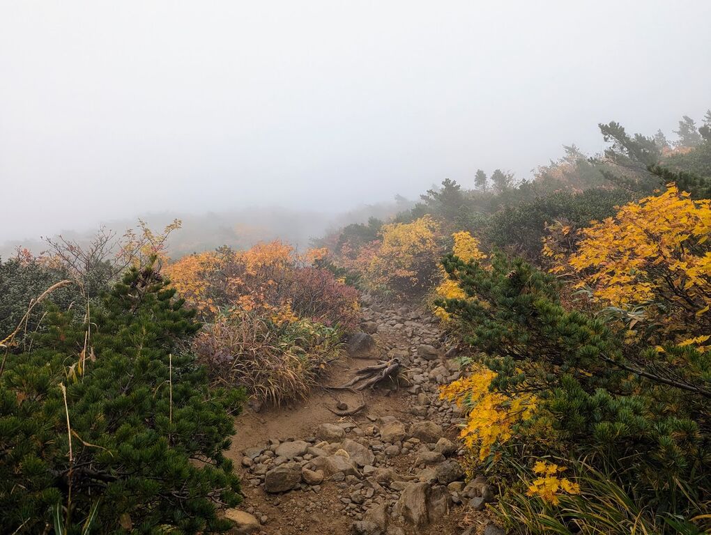 紅葉は始まっていたと思いますが、濃い霧で視界が悪すぎて近くの景色しか見えません。しかも登り出すと雨と風が強くなってきている雰囲気に・・・