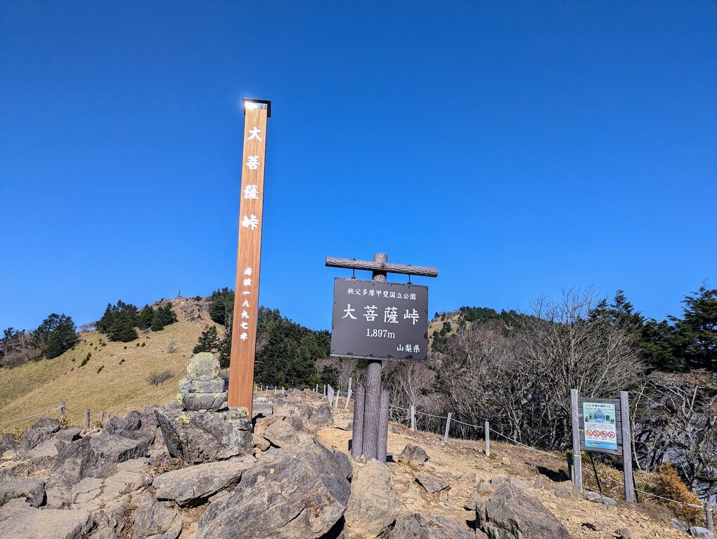 約1時間で大菩薩峠に到着。登りは結構な体力消耗で汗をかくのですが、これがまた3分も休憩すると寒くなります。