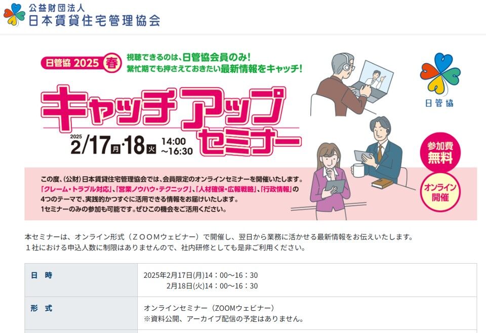 セミナーの方は2月17日(月)にWEB生放送となっておりまして、お申し込みは日管協の会員さん限定となります。