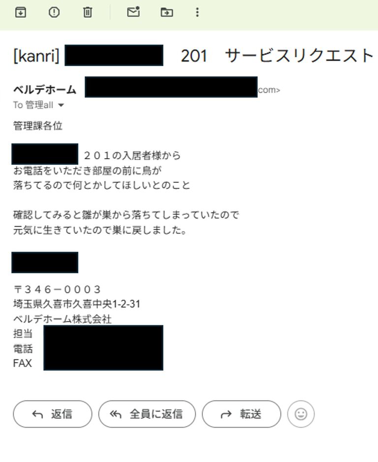 〇〇アパート 201の入居者様からお電話をいただき部屋の前に鳥が