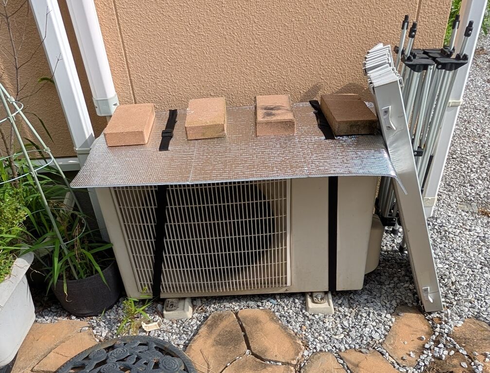 さて、本日は朝から自宅のエアコンの日除けを取り換える作業をしました。夏場のエアコンの効きを良くするためには室外機に日除けを作った方が良いと聞いて2年くらい前に設置したのですが、安物のテントマットのようなアルミシートは劣化が早いようでボロボロになっていました。