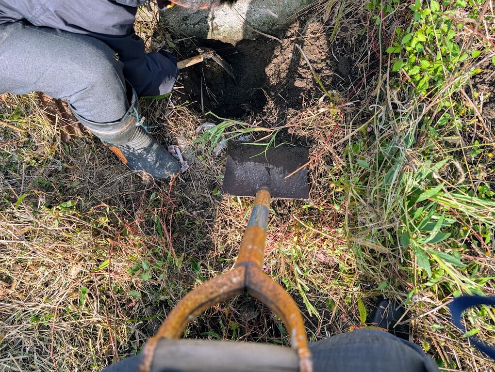 グレーチングの周りを結構掘ったところ、空洞を発見。単純にグレーチング桝のコンクリ部分の切れ目でしたので、地下にパイプは無いと判断できました。