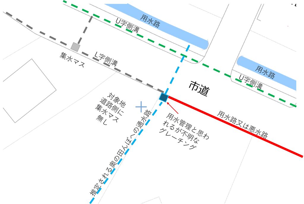 そして、自分達が想像していた市道の下を用水が通っている件も違っているとのこと。用水の位置に関しては土地改良区の事務所にあった地図の通りですが、何らかの理由で水が入ったことが無いのでは無いかと売主さんは仰っていました。
