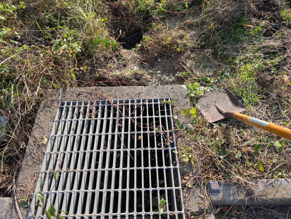 単純にグレーチング桝のコンクリ部分の切れ目でしたので、地下にパイプは無いと判断できました。