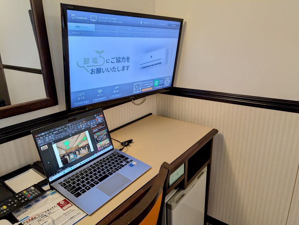 その後は資料作成に集中。ノートPCの他にHDMIケーブルを持参しましたので部屋のTVと繋いでダブルモニターにしようと思っていたのですが、これがまたテレビが可動しないよう壁にしっかり固定されていて、どこに差し込んで良いのかポートが見えず断念。