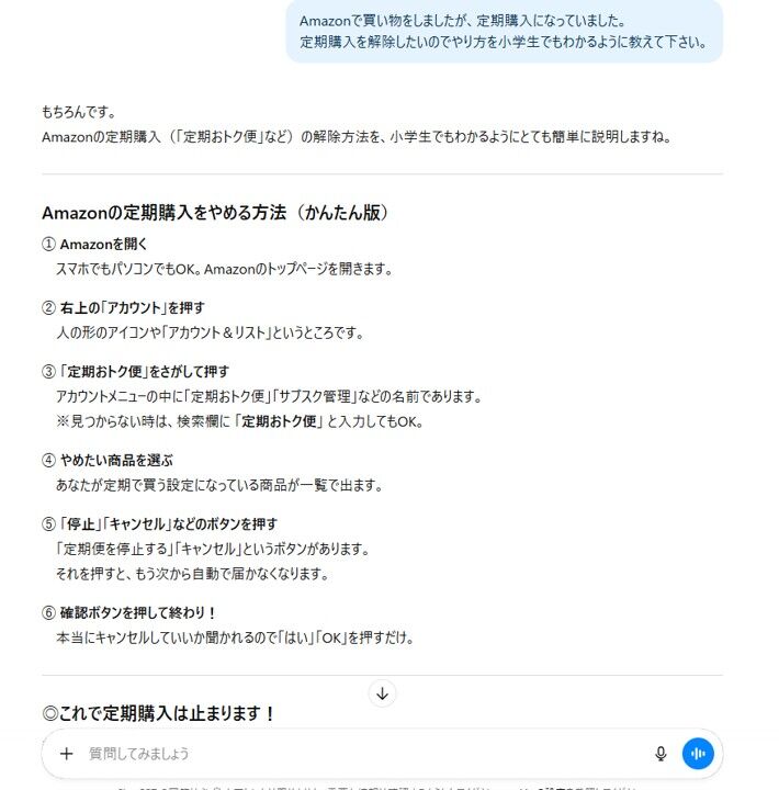 ちょうど良い機会なのでChatGPTに定期購入の解約のしかたを質問してみました。クマ 「小学生でもわかるように教えてって入れるとわかりやすく出て来るよ」